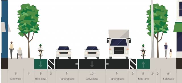 The latest plans work towards balancing all of these needs of our street: safer pedestrian facilities by shortening crosswalks and making more pedestrian space at intersections; protected two-way bicycle infrastructure so it’s safe for all ages to bike; and prioritizes loading zones, freight delivery, and ridehailing pick-ups and drop-offs higher than long-term metered parking and unregulated parking during certain hours.